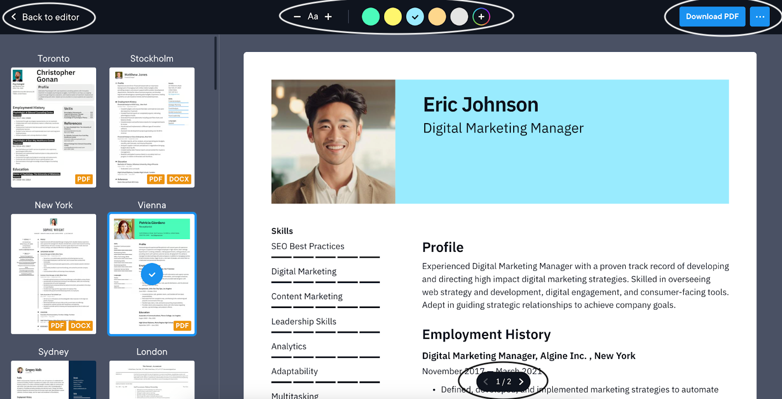Within the template selector page, you’ll be able to navigate between all of our designs, choose from our theme colors (or pick your own!), and adjust the line spacing of your resume. Use the arrows at the bottom of the page to preview the various pages of your resume. You can export your resume right from the template selector, or click “Back to editor” to continue writing.