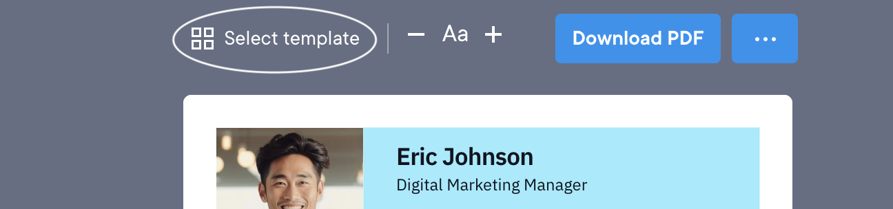 To change your resume template, first open your resume within the builder app. On the right side of the screen above the resume preview, click “Select template”.