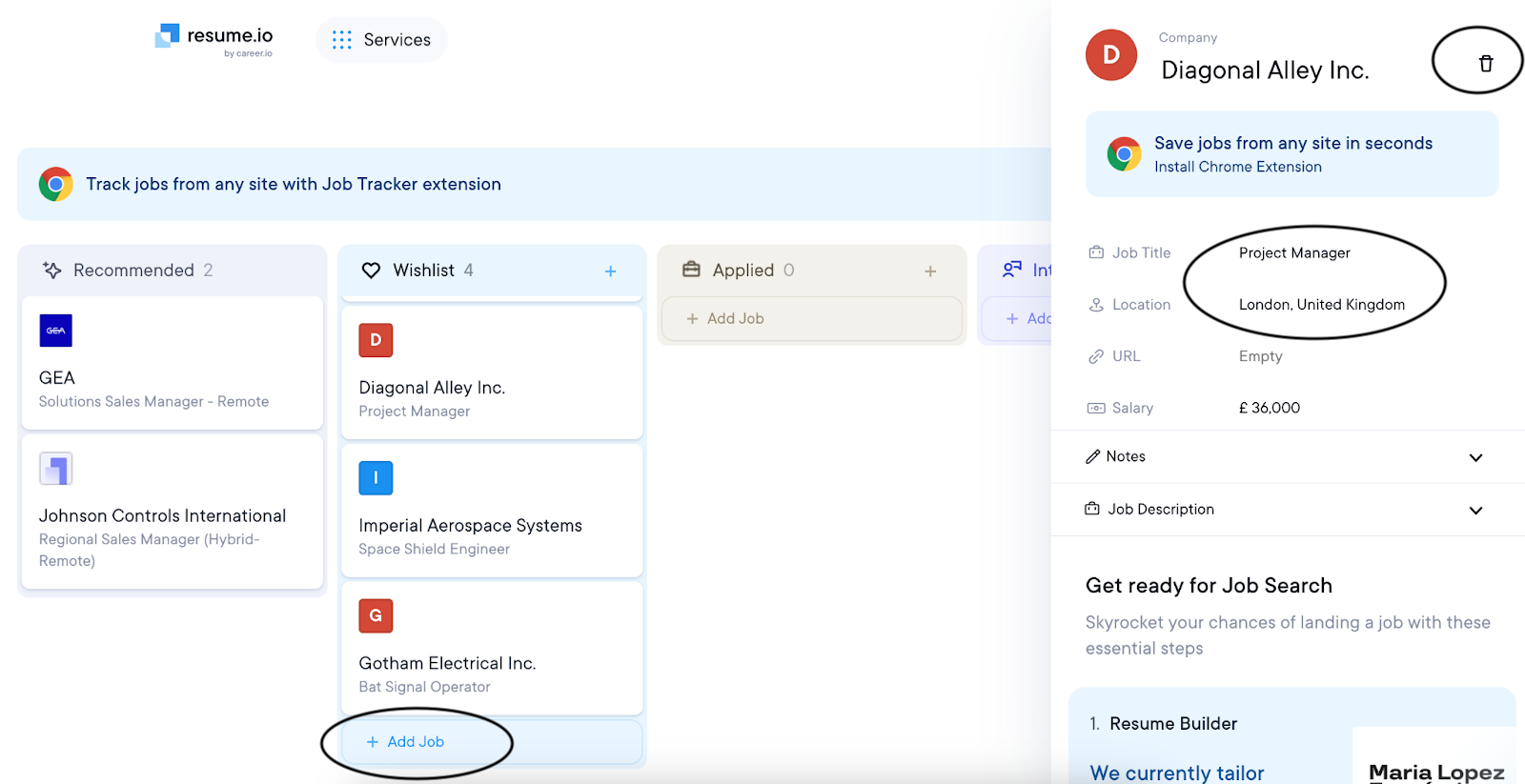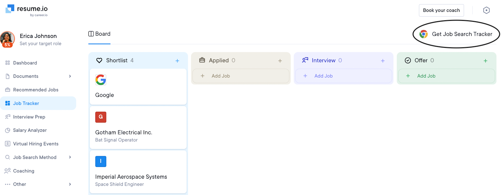 Log into your resume.io account. Navigate to the Job Tracker feature located within the menu on the left side of your screen